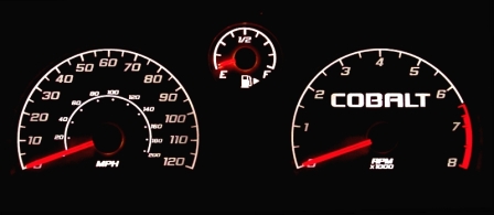 Standard gauge face colors for the Chevy Cobalt are white, silver and black. The standard lighting colors are neutral, red, light blue, green, and yellow. Standard logos are shown at bottom of the page. For custom designs or custom colors call 1-866-943-8641. Prices listed are for the gauge face only - cluster is not included. **Note: If ordering a black or carbon fiber design face with the blue lighting color option, the LED upgrade is strongly recommended.When ordering a white or silver face, the daytime color of the numbers and markings will match your lighting color choice.